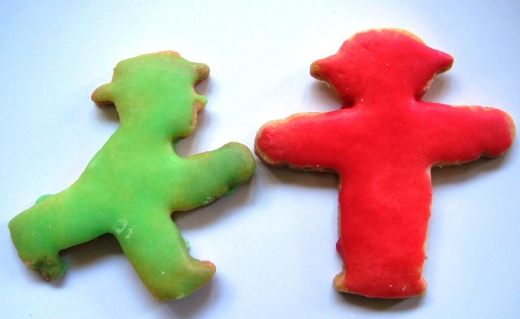 Jeweils etwas Puderzucker mit Wasser zu Zuckerguss verrühren und mit eine wenig Lebensmittelfarbe rot bzw. grün einfärben.