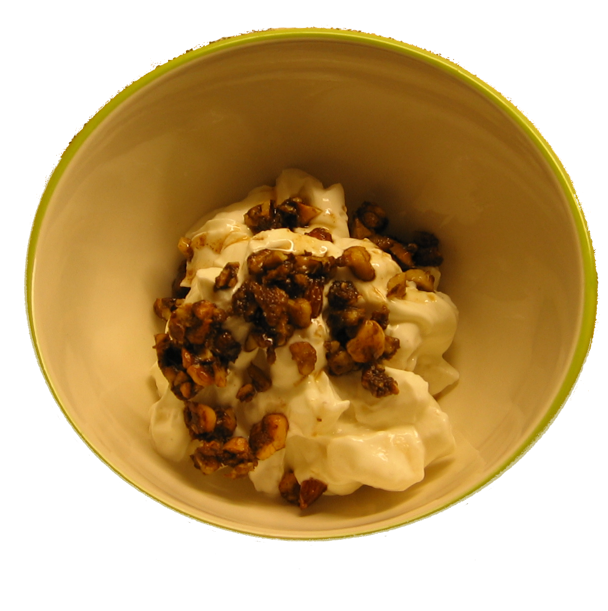 Die Nusskerne mittelgrob hacken. Die Butter mit dem Zucker schmelzen, die Nusskerne darin bei mittlerer Hitze unter Rühren knusprig braten. Mit 1 Prise Zimt oder Lebkuchengewürz mischen und beiseite stellen. Die Sahne mit dem restlichen Vanillezucker steif schlagen und unter den Quark heben. Birne ebenfalls unterheben und den Quark in Schälchen verteilen. Mit den Nüssen bestreuen und servieren.