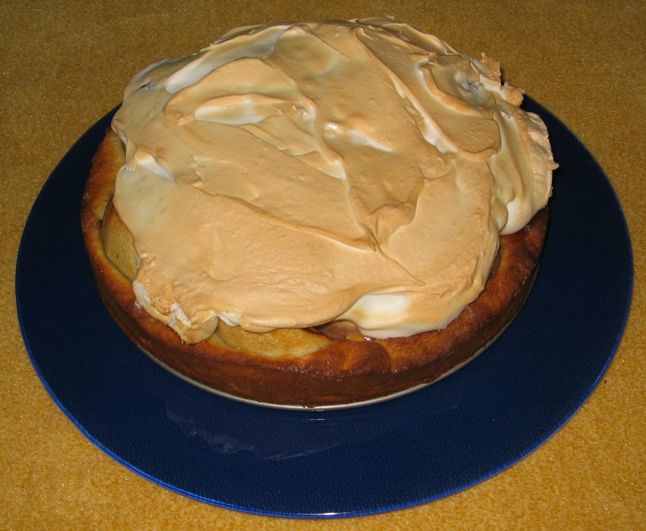 Im Ofen bei 160-180°C Umluft in der Mitte für ca. 30-45 Minuten backen. Kurz bevor der Kuchen aus dem Ofen kommt die Eiweiße mit einer Prise Salz steif schlagen und dabei nach und nach dem Puderzucker unterrühren. Die Masse möglichst gleichmäßig auf dem Kuchen verteilen und in 10-15 Minuten fertig backen. Der Eischnee sollte leicht braun, aber keinesfalls zu dunkel sein.