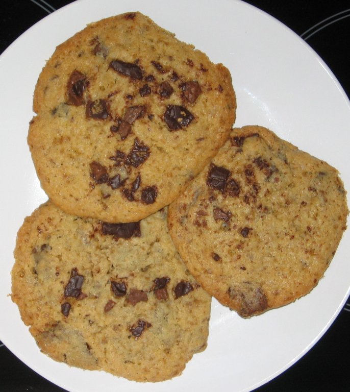 Zunächst die Schokolade grob hacken und dann Butter, Zucker und Salz sehr schaumig rühren. Das Ei gut unterrühren und dann Mehl und Backpulver hinzugeben. Am Schluss noch zwei drittel der Schokolade unterheben und den Teig teelöffelweise mit ausreichend Abstand auf ein mit Backpapier belegtes Blech setzen. Etwa 9 Portionen pro Blech. Die restliche Schokolade auf die Cookies verteilen.
