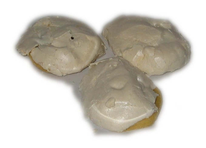 Das Eiweiß wird mit dem Zitronensaft steif geschlagen und dabei lässt man langsam den restlichen Zucker einrieseln. Der so gewonnene Eischnee wird nun über die Toffifee auf die Kreise gespritzt, so dass die Toffifee ganz bedeckt sind.