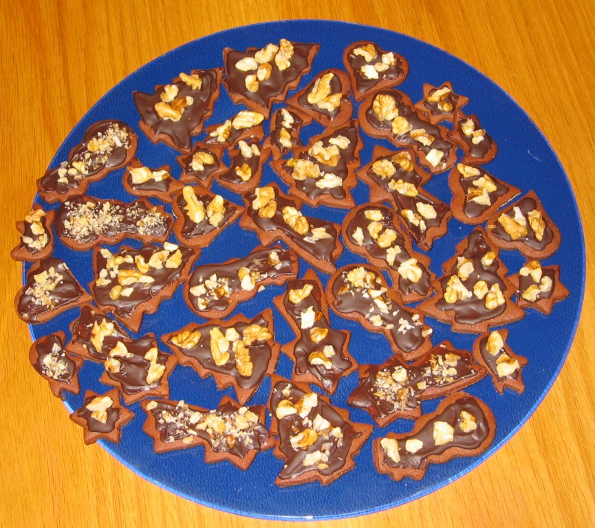 Die Plätzchen nach dem Backen zusammen mit dem Backpapier auf ein Küchenrost ziehen und dort erkalten lassen. Nachdem sie erkaltet sind etwas Schokolade grob hacken und in einem Wasserbad schmelzen. Jedes Plätzchen mit der Schokolade bestreichen und nach belieben mit Nüssen verzieren.