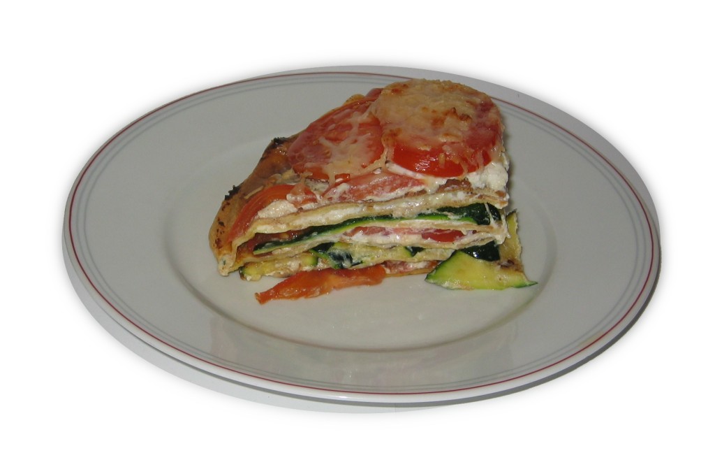Der Backofen sollte nun auf 200°C vorgeheizt werden. Dann wird die Springform eingefettet. Die Pfannkuchen werden nun jeweils von einer Seite mit der Ricotta-Creme bestrichen und abwechselnd mit einer Schicht Zucchini bzw. Tomaten aufgeschichtet. Man sollte so beginnen, dass man oben mit einer Schicht Tomaten abschließt. Über diese kommt dann der Rest (20g) Parmesan.
