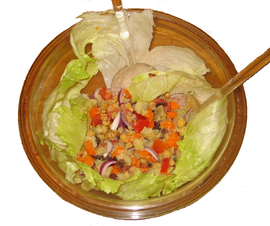 Die Salatschüssel mit einige Blättern des Eisbergsalates auslegen und die Gemüsemischung zusammen mit Sultaninen, Walnüssen und Zwiebelringen darauf anrichten.