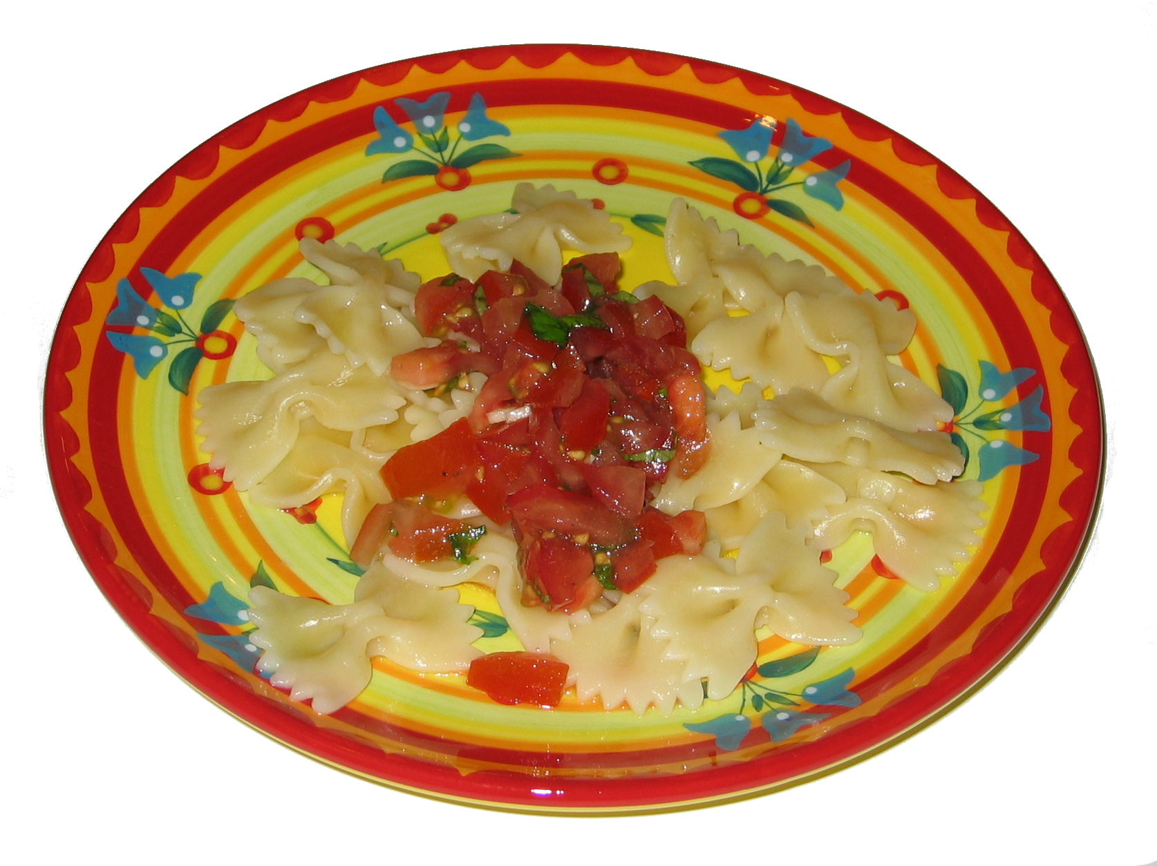 Nudeln ins kochende Wasser geben. Einige Blättchen Basilikum (ca. ein halbes Bäumchen) mit der geschälten Knoblauchzehe sehr fein hacken und mit dem Olivenöl unter die Tomaten mischen.