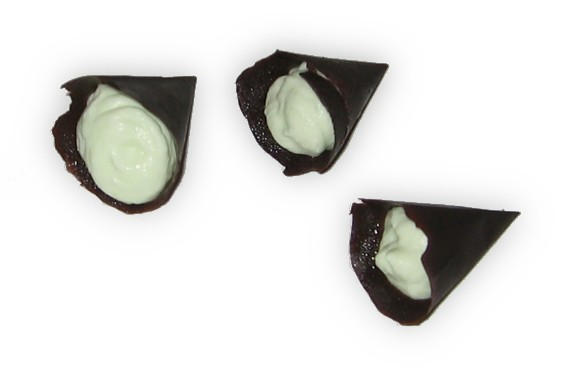 Für die Füllung die Sahne in eine Schüssel geben, mit dem Handrührgerät halb steif schlagen, dann langsam den Puderzucker und den Pfefferminzlikör hinzu geben und vollständig steif schlagen. In einen Spritzbeutel mit sternförmiger Tülle geben und langsam in die Schokoladen-Hörnchen spritzen. Kalt aufbewahren.